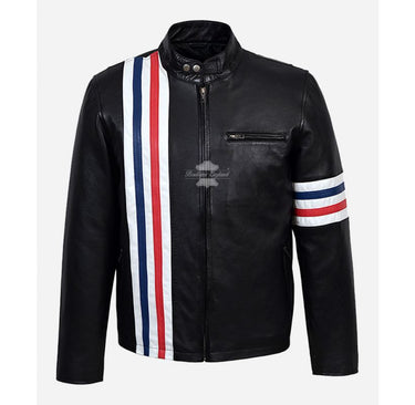 Embody the spirit of the open road with our Easy Rider Leather Jacket. Made from soft and supple black and tan colored lambskin leathers, this biker leather jacket for men is both comfortable and stylish. The leather stripes on the right side of the chest and left sleeve add a touch of visual interest, while the classic black color makes this jacket a versatile addition to any wardrobe. Whether you're a seasoned biker or just looking for a stylish layer, this jacket is the perfect choice.