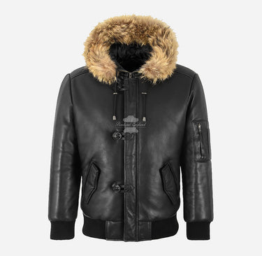 HARRIER Herren Bomberjacke aus Leder mit Kapuze und Fellkapuze, Schwarz