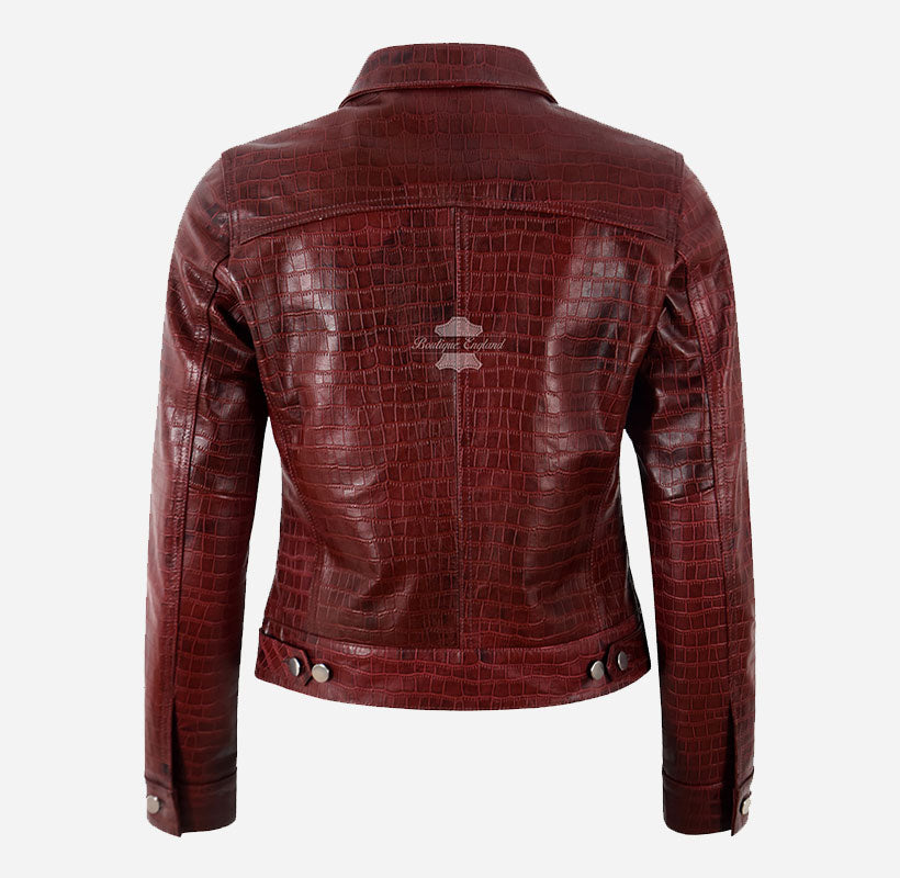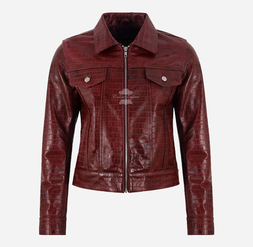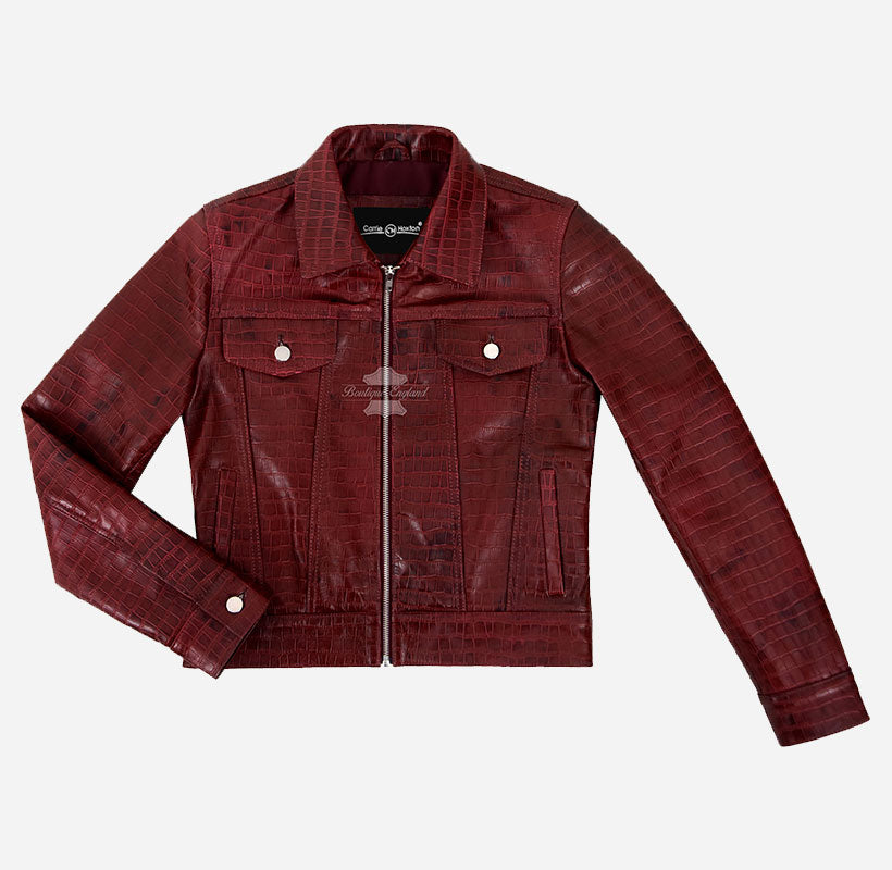 The GREER Women’s Croc Print Trucker Leather Jacket is a perfect blend of modern fashion and timeless trucker style, designed for women who love to stand out. Crafted from premium croc print cowhide leather, this jacket features a classic shirt-style collar, front zip closure, and snap-stud cuffs for a structured yet stylish look. The soft leather construction ensures all-day comfort, while the smooth polyester lining adds ease of wear. Finished with four functional outer pockets, this versatile jacket is ideal for casual outings, everyday wear, or statement styling, making it a must-have addition to any fashion-forward wardrobe.
