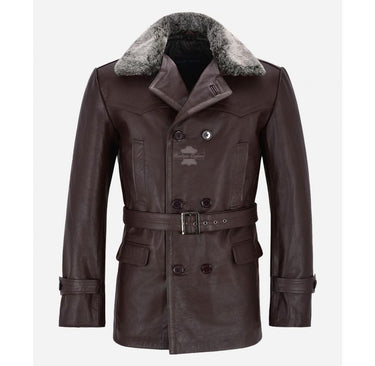Step into the world of science fiction with our Dr. Who inspired leather pea coat in rich brown and black cowhide leather. The coat features a warm and cozy fur collar that adds a touch of luxury, while the belted design cinches in at the waist for a flattering silhouette. Made with high-quality leather, this coat is both stylish and practical, perfect for braving the elements in style.