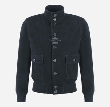 The OTIS Men’s Goat Suede Leather Bomber Jacket redefines smart-casual style with its luxurious goat suede construction, offering a soft, lightweight, and refined texture that ages beautifully over time. Inspired by the classic A-1 flight jacket, it features a button-up front, stand collar with button fastening, and ribbed trims at the cuffs and hem for a comfortable, tailored fit. Two functional patch pockets with flaps and buttons add practicality and character to its timeless blouson silhouette. Designed in a rich navy tone, this premium suede bomber delivers effortless sophistication for both casual outings and refined occasions.