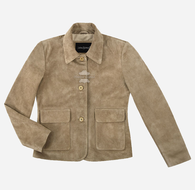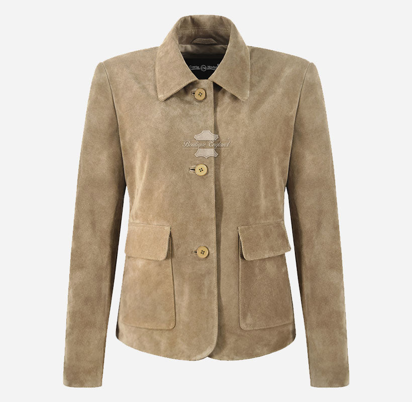 Refine your everyday style with the IMOGEN Women’s Button Down Collared Suede Coat, a timeless outerwear piece crafted from soft suede leather in a versatile beige tone. Designed for a polished yet effortless look, it features a classic collared neckline and a button-front closure that adds a touch of sophistication to any outfit. The tailored silhouette offers a flattering fit, while the two front flap pockets provide both practicality and style. With its soft suede finish and long sleeves, this coat is perfect for layering during spring, autumn, or mild winter days, making it a versatile wardrobe essential that pairs beautifully with jeans, trousers, or dresses.