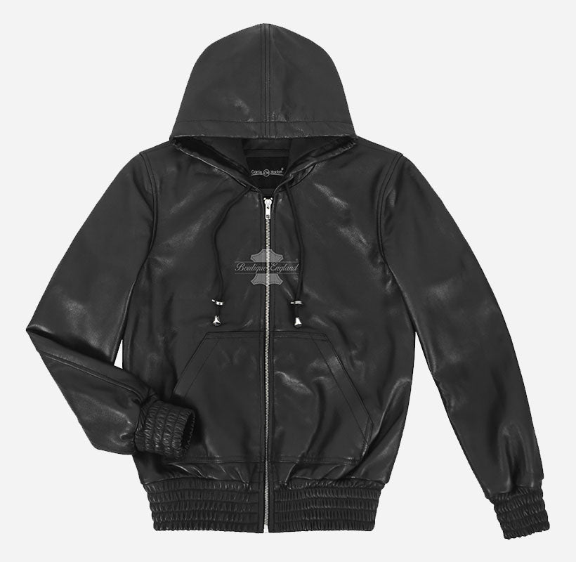 ZELDA Women’s Black Leather Hooded Bomber Jacket