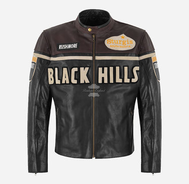 - Cette veste de motard en cuir pour hommes comporte des badges sur les épaules et la poitrine - Badges Black Hills à l'avant et à l'arrière