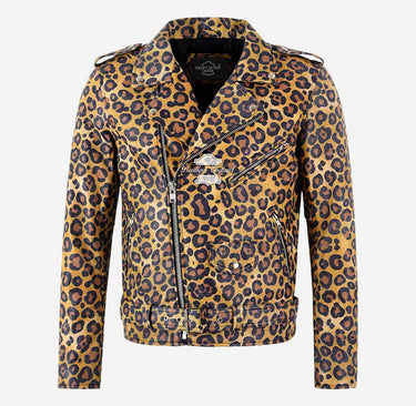 Introducing the BRANDO Biker Style Leopard Print Leather Jacket, a true statement piece for those who crave an exotic edge to their fashion. This exotic print leather jacket is crafted from luxuriously soft lamb napa leather, this jacket boasts a lapel collar and an alluring asymmetrical zip fastening that exudes effortless style. Whether you're hitting the streets or making an entrance at parties, this jacket is your go-to choice for an unforgettable look. Channel your inner wild side with the fierce leopard print that's not just a pattern but a fashion statement. Elevate your wardrobe with this head-turning masterpiece that combines quality, style, and a hint of the untamed. Step into the spotlight and seize the night with the BRANDO Leopard Print Leather Jacket.