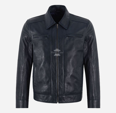 A timeless staple with a refined edge, the SWAY Men's Collared Leather Jacket in Navy is designed for effortless sophistication. Crafted from supple sheep Nappa leather, it features a classic fold-back collar, clean center zip fastening, and zippered chest pockets that nod to vintage moto style. Additional side slip pockets, two interior pockets, and a silky polyester lining provide comfort and practicality. Whether layered over casual or smart looks, the SWAY jacket delivers versatile style with a sleek, modern finish.