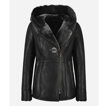 Stay cozy and stylish this winter season with the Hazel Sheepskin Hooded Coat. This premium quality coat features a Black color outer made from high-quality sheepskin leather that is both durable and stylish. The real shearling fur lining provides warmth and comfort, making it the perfect coat for even the coldest winter days. The front zip closure adds a modern touch to the coat, while the hood adds an extra layer of protection from the elements. The coat's design is both comfortable and flattering, making it a versatile piece that can be dressed up or down. Whether you're heading to work or out for a night on the town, the Hazel Sheepskin Hooded Coat is sure to keep you warm and stylish.